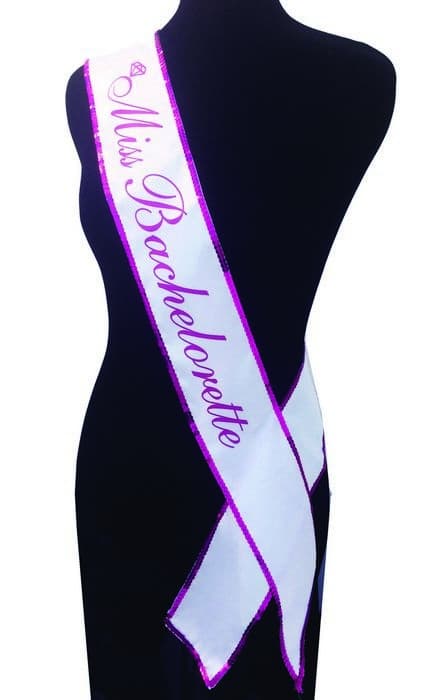 Miss Bachelorette Sash. The perfect addition to any Bachelorette party wardrobe. This 5 feet long sash is adjustable to fit all bachelorettes. For additional fun, pin on candy or condoms. A sparkling addition to your Bachelorette or bridal party wardrobe that is sure to enhance your night of fun! You will definitely be the center of attention with this 5 feet long party sash. Adjustable to fit most party goers. For additional fun, pin on candy or flowers. Safety pin not included. This will be an occasion that you will never forget! Miss Bachelorette Sash from Little Genie Productions Adult Novelties. Ctagories: Party Games, Gifts, Supplies, Adult Party Supplies, Risque Party Wear, For the Bachelorette Party. 2023.