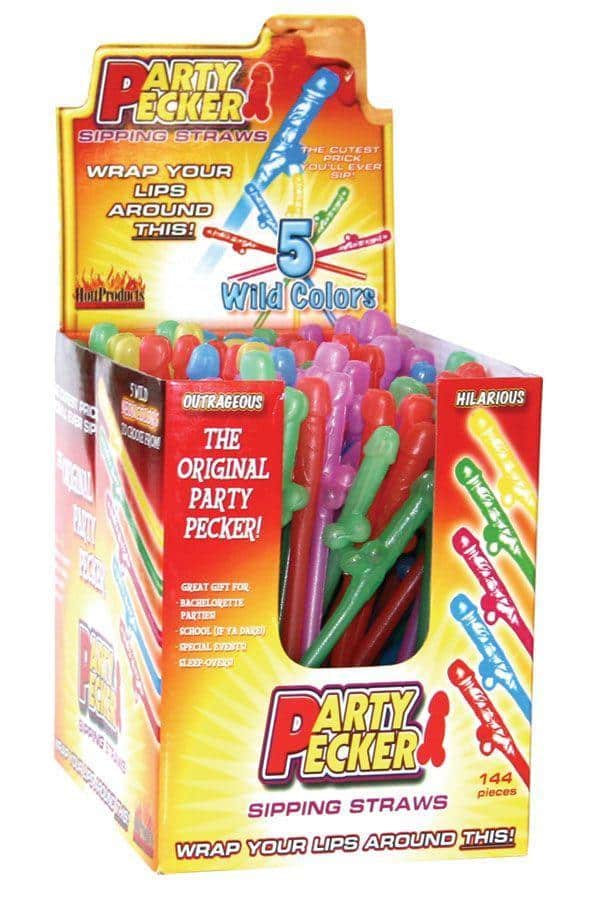 This Party Pecker Sipping Straws Display from Hott Products contains 144 veined, phallic shaped straws with crooked little balls in five wild colors. They make great items for bachelorette parties, college parties, special events, and even sleep overs! For a party in your mouth, slide this straw deep into your favorite drink! Party Pecker Straws 144 Pieces Point of Purchase Display from Hott Products Unlimited. Categories: Party Games, Gifts and Supplies, Adult Party Supplies, For the Bachelorette Party, Barware. 2023.